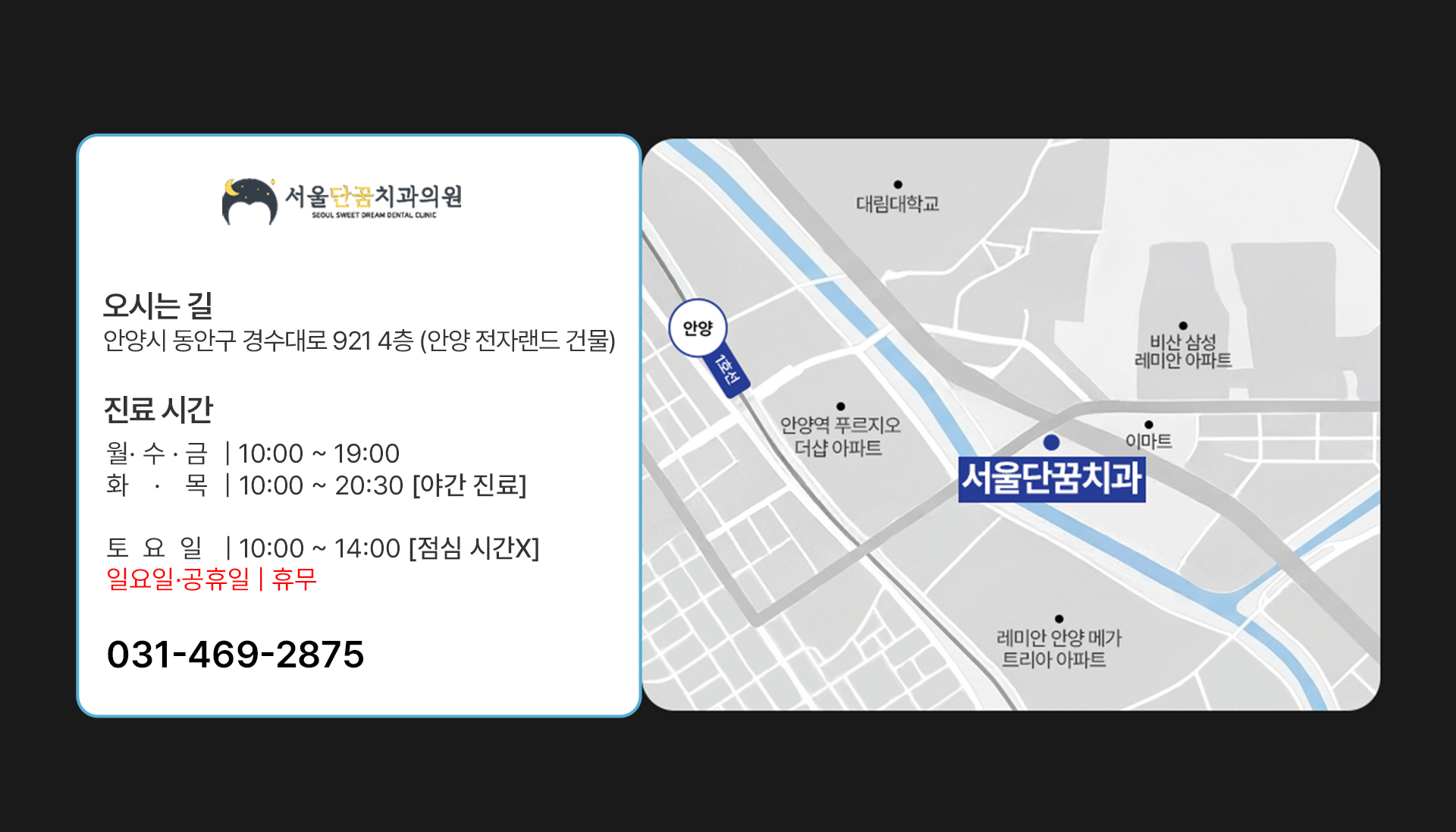 (1) 서울단꿈치과의원 회원에게 서비스를 제공할 수 있는 서비스 투자기반의 일부는 광고게재를 통한 수익으로부터 나옵니다. 회원은 서비스 이용시 노출되는 광고게재에 대해 동의합니다.